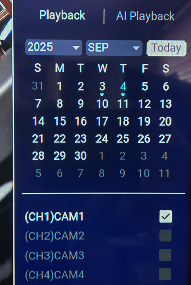 The coloured bar on the bottom will show if there is video recorded on that date, with orange sections where events were recorded. Use this to browse your recordings and locate the time period you are interested in.