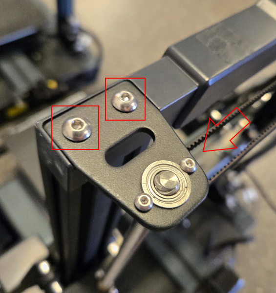 If the Z-axis belt on the top of the gantry is loose, unscrew the two screws in the red boxes by one turn, push the plate outwards in the direction of the arrow, and hold it there whilst tightening the screws back up. Do this for both sides.